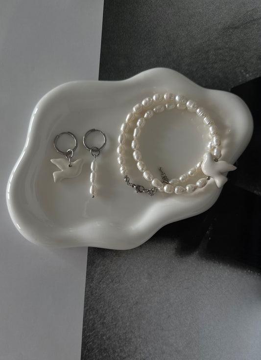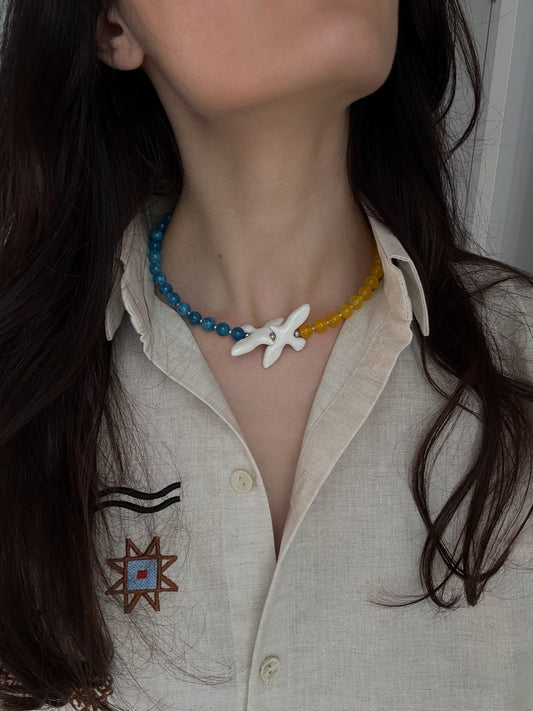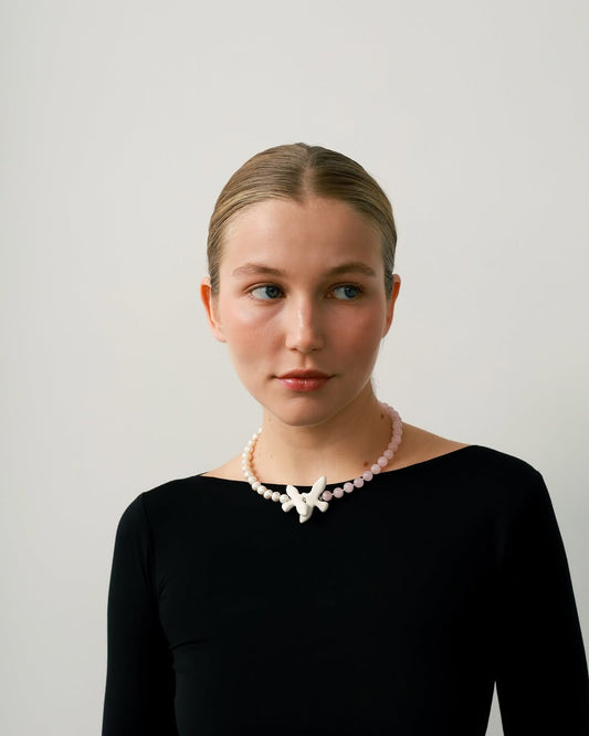 The collection includes porcelain necklaces, jewerly made of natural pearls and ceramic beads.