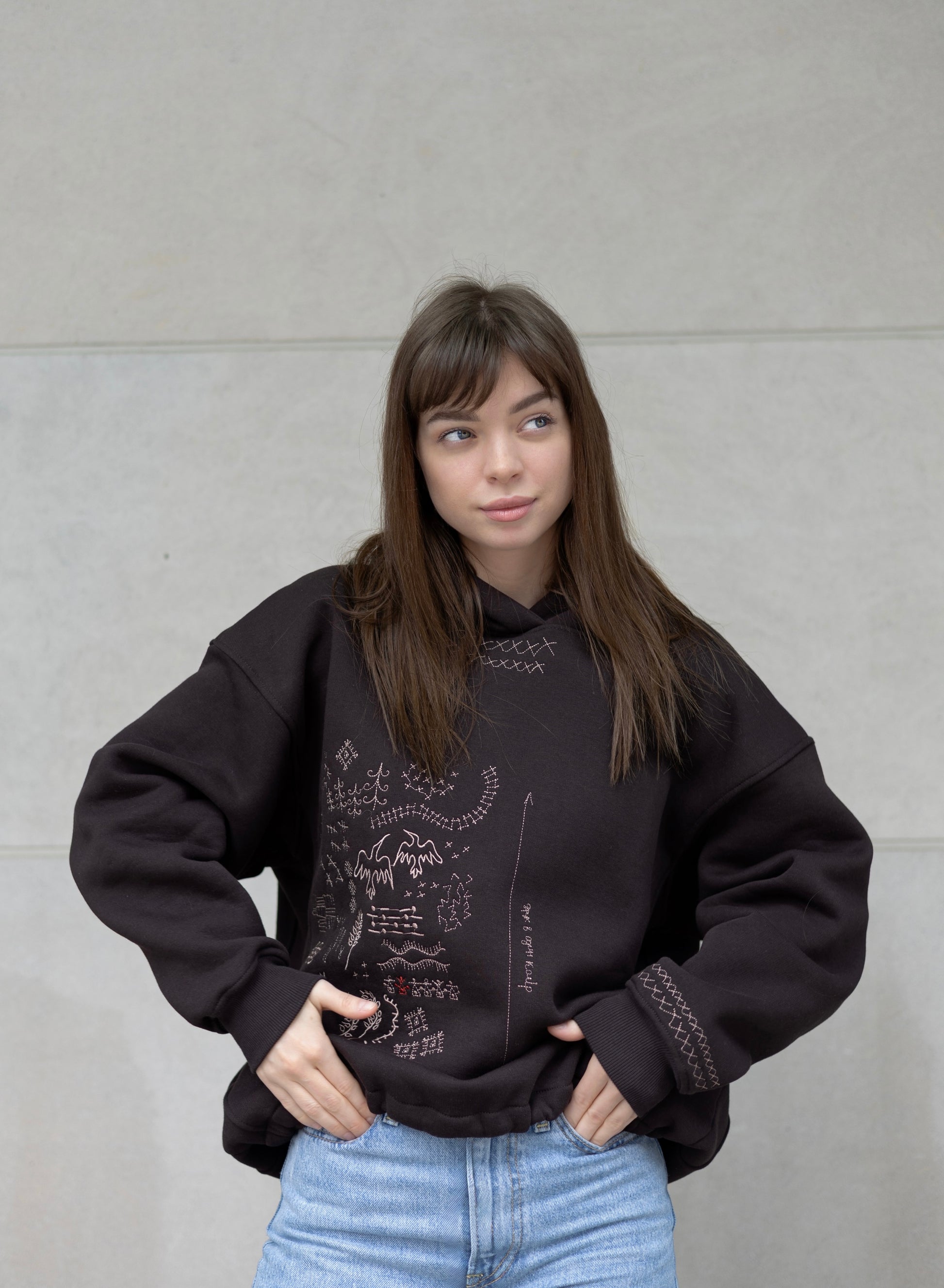 The hoodie features a designer embroidery inspired by traditional Ukrainian symbols.